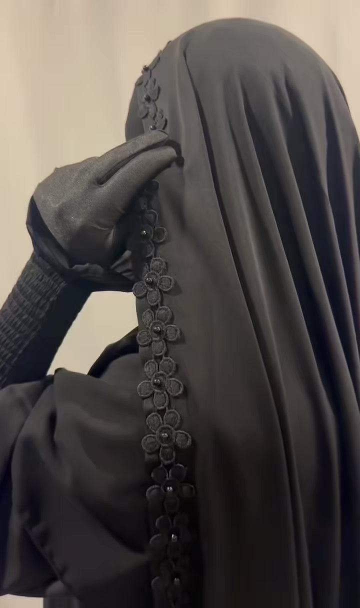 Our Maryam 3pc set includes a pleated abaya with a scrunch sleeve, pocket in front, flower beaded embroidered Chador similar to a floor length Ghaswa and a half niqab.